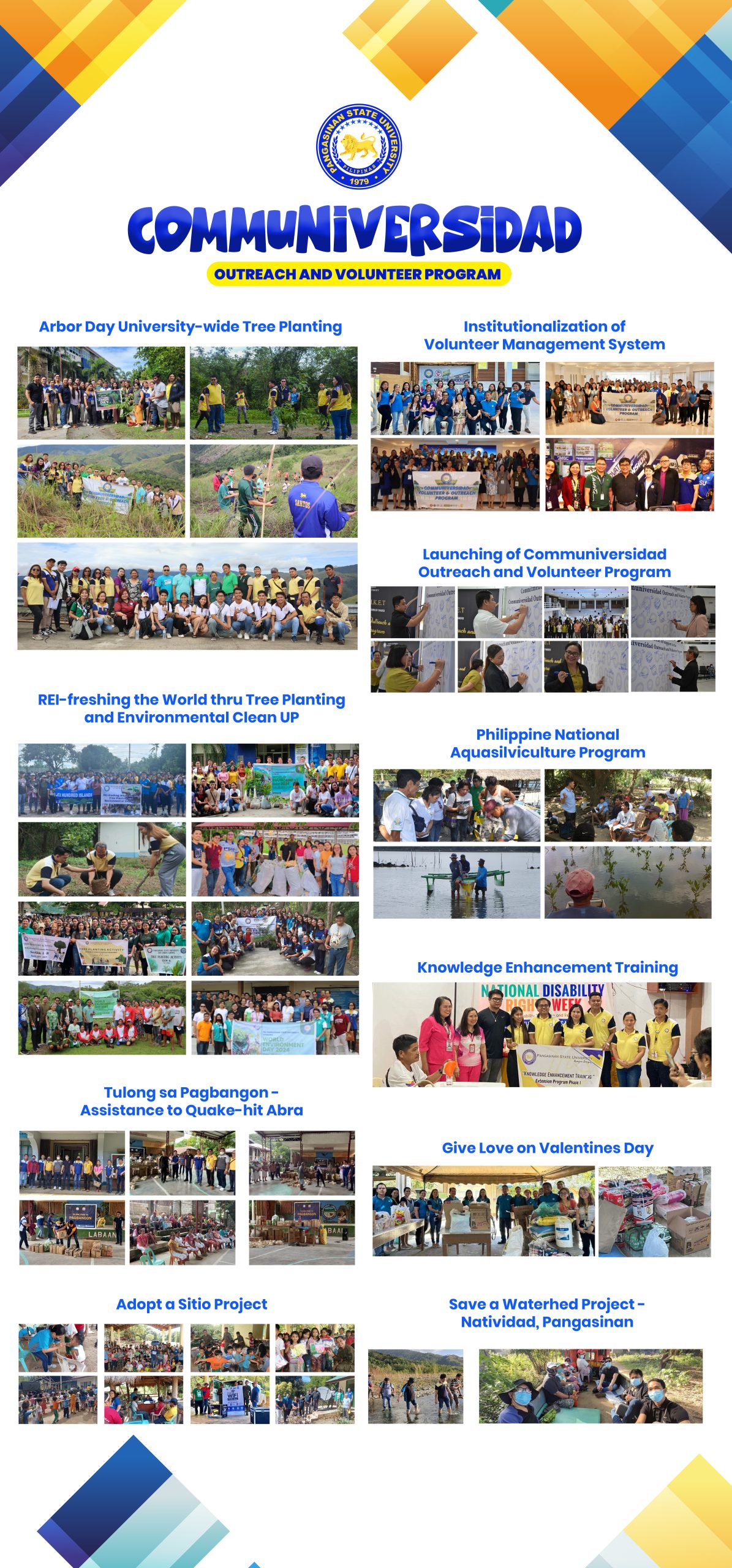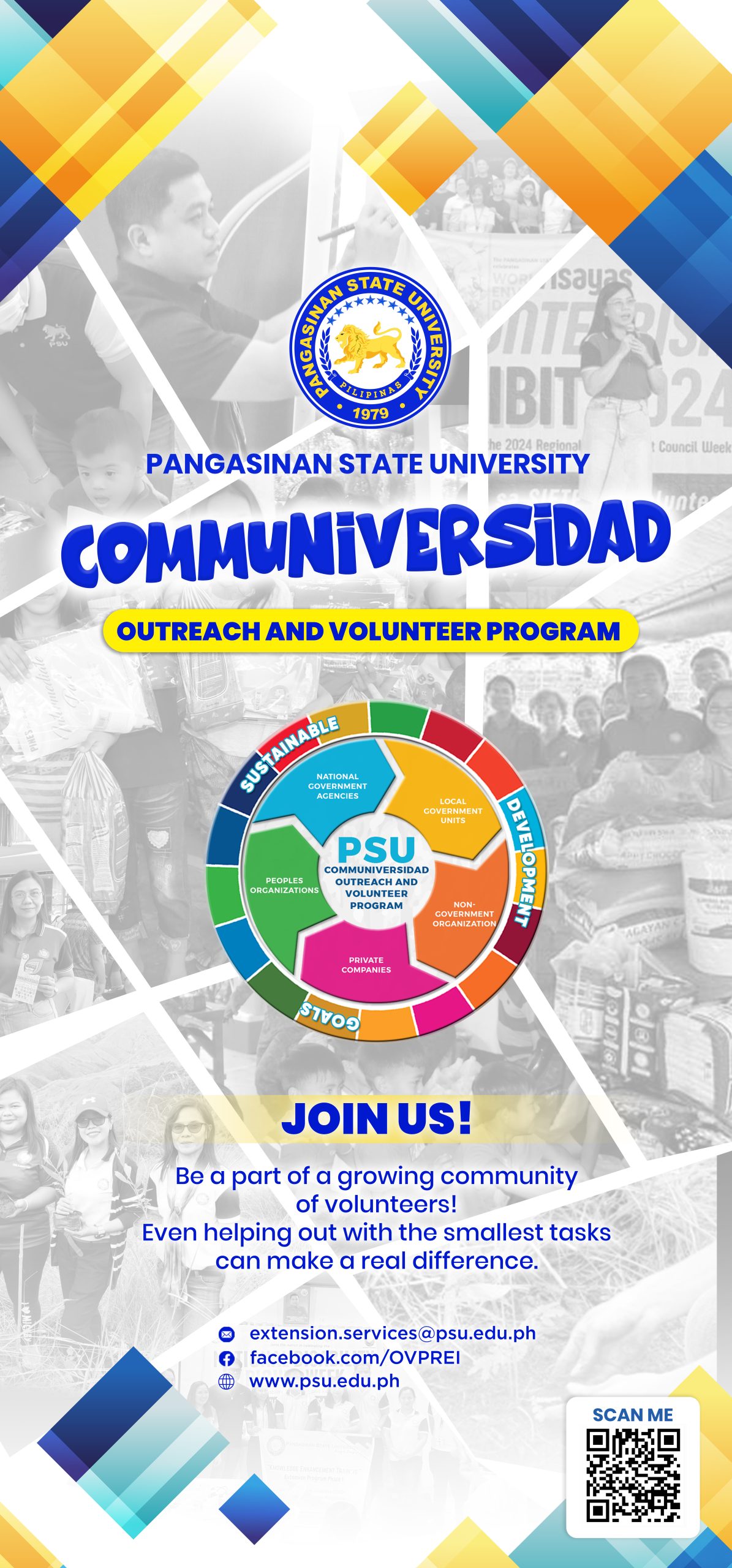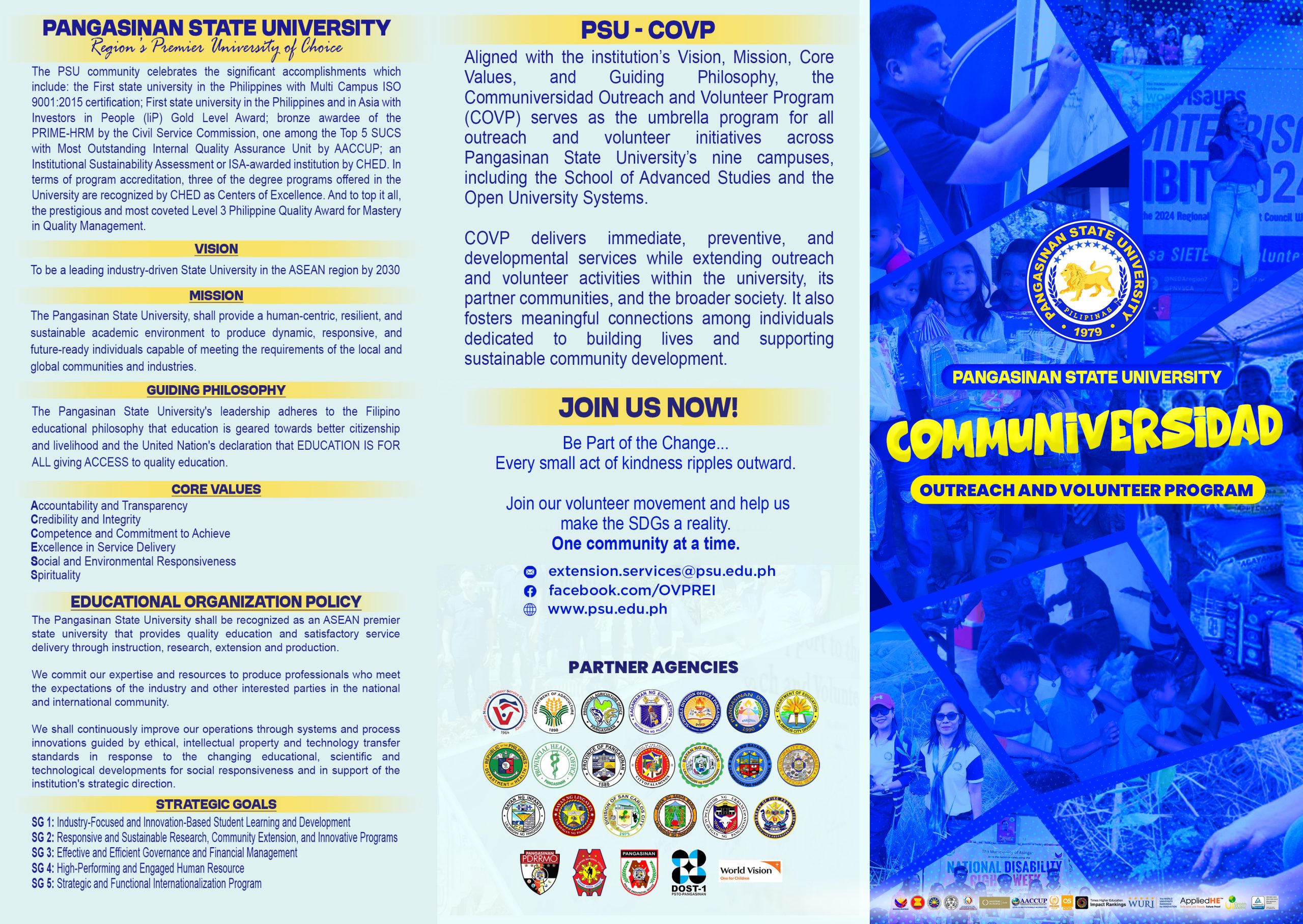 Anchored on Pangasinan State University’s commitment to social responsibility, inclusive development, and community empowerment, the Communiversidad Outreach and Volunteer Program (COVP) serves as the University’s umbrella platform for all outreach and volunteer initiatives across its campuses. COVP brings together faculty, students, staff, alumni, and partners to deliver responsive, sustainable, and impact-driven extension services that address real-world community needs.