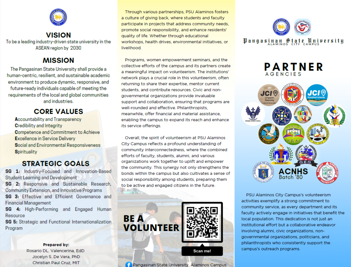 In the promotion of volunteerism, Pangasinan State University through its Research, Extension and Innovation Division, puts a united effort in serving the community. The REI, in collaboration with the Philippine National Volunteer Service Coordinating Agency (PNVSCA)...