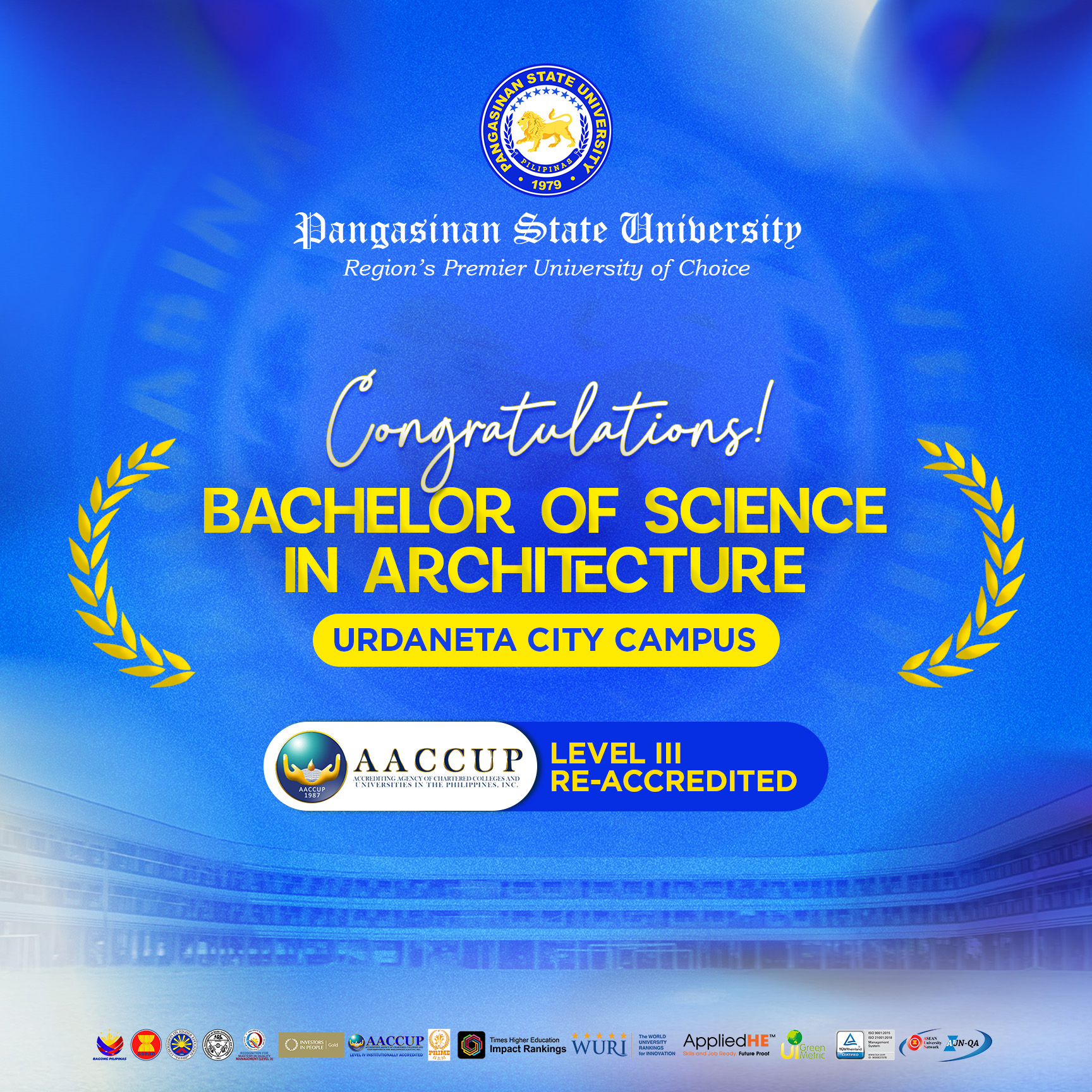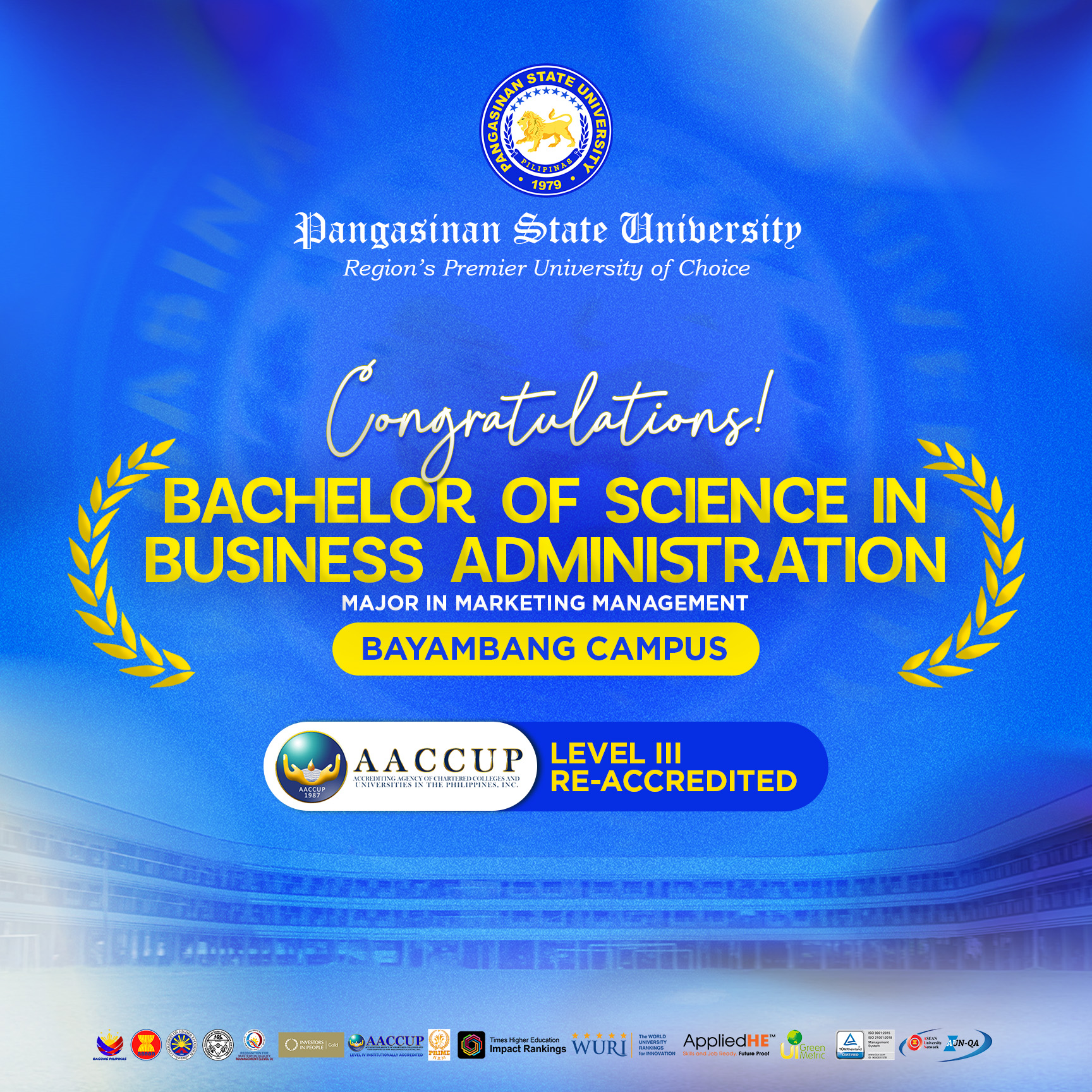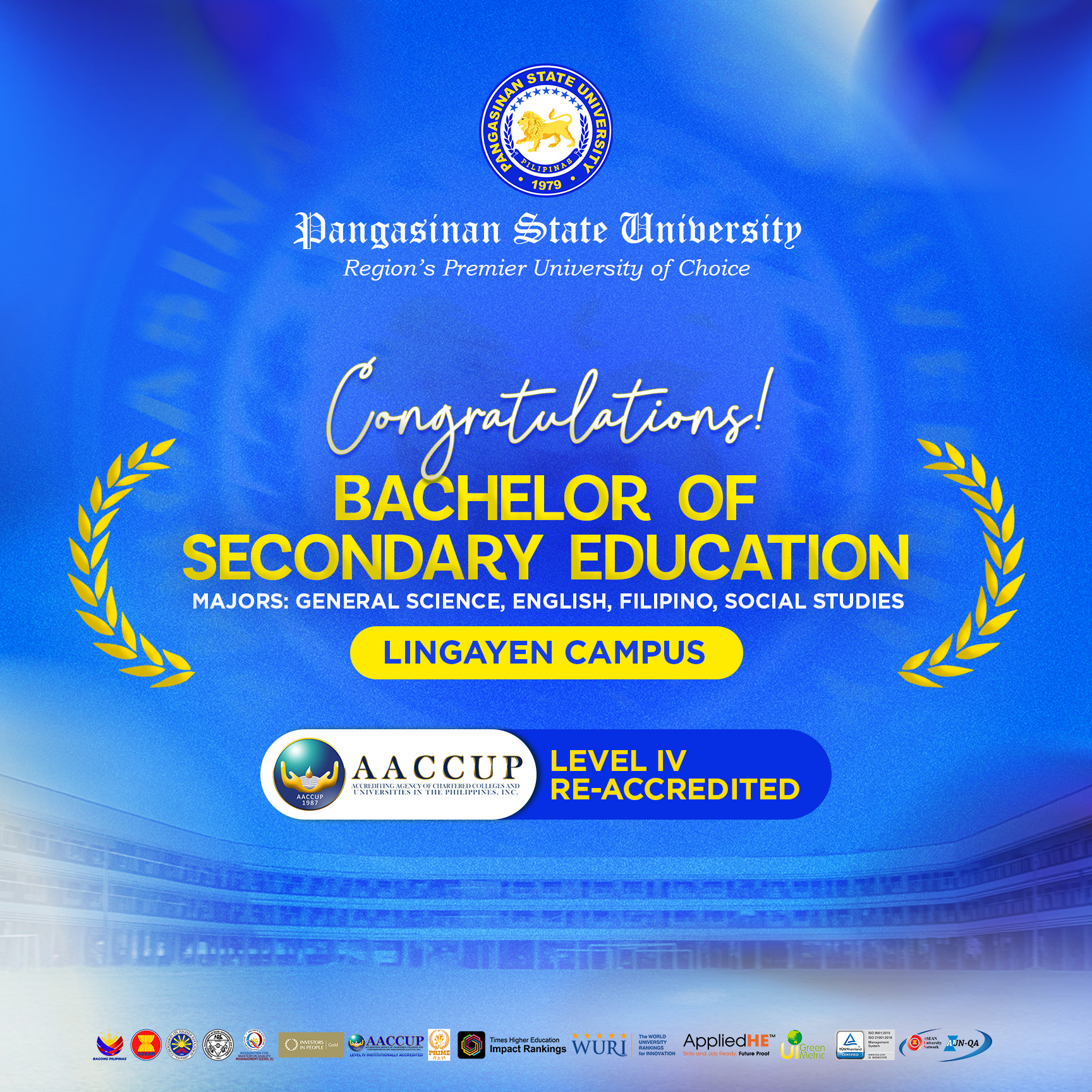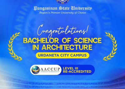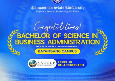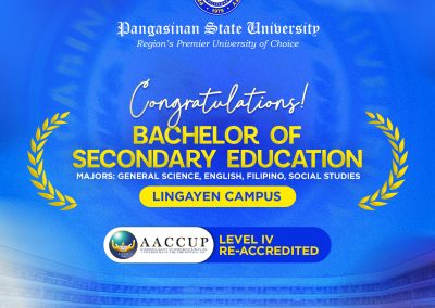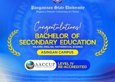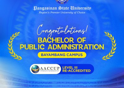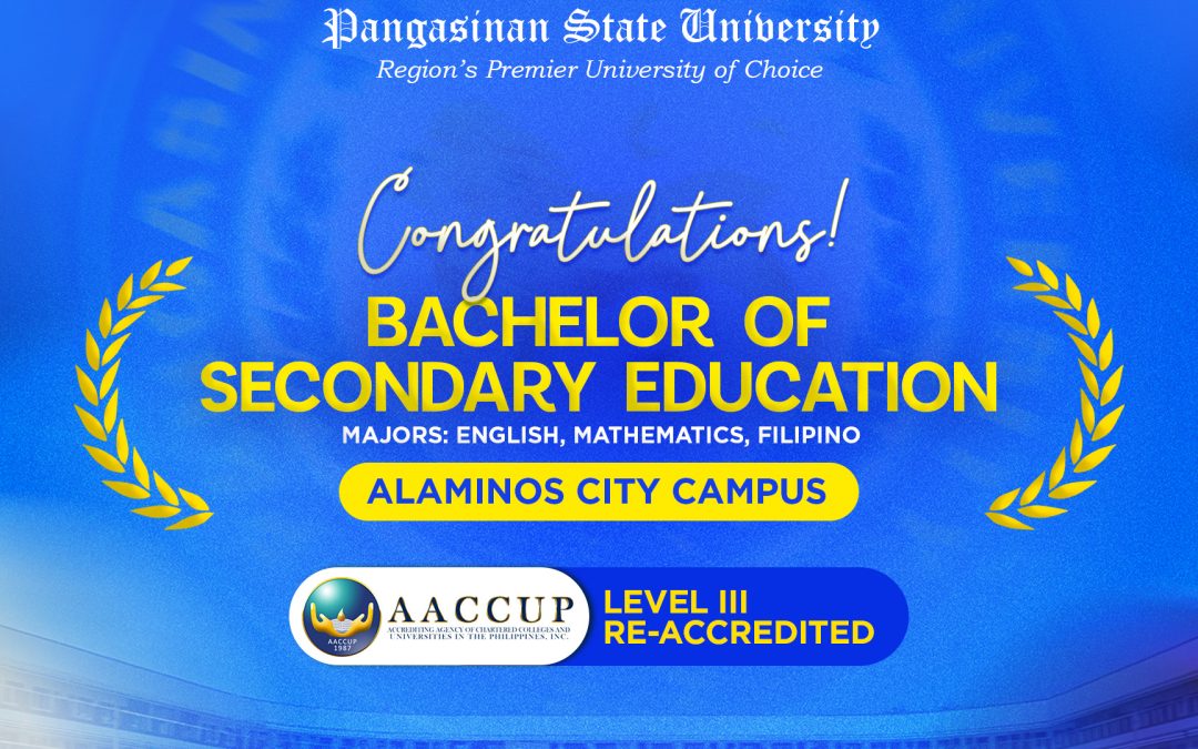 Pangasinan State University proudly celebrates the successful re-accreditation of eight of its Programs from five campuses by the Accrediting Agency of Chartered Colleges and Universities in the Philippines (AACCUP) for 2026, affirming commitment to institutional quality excellence.