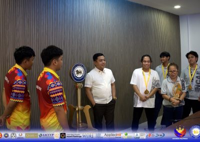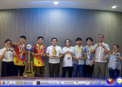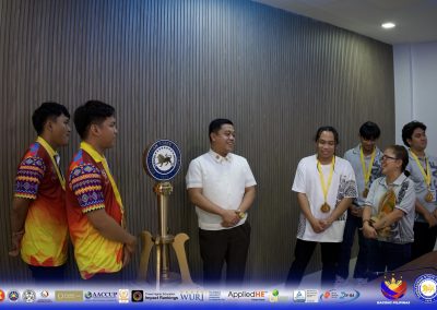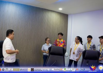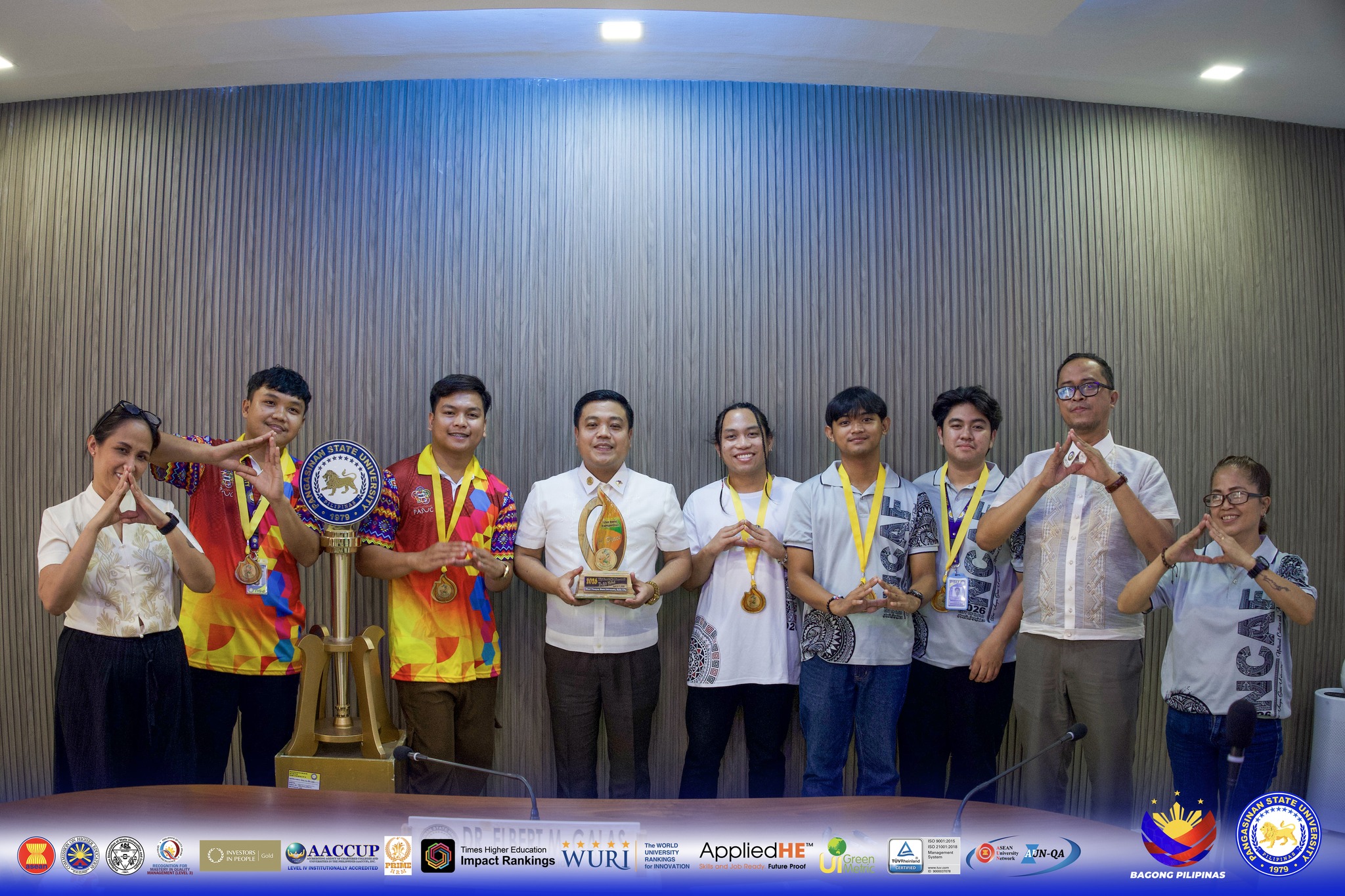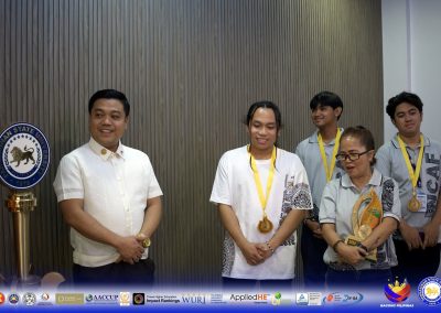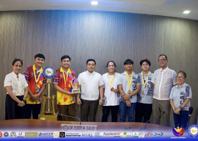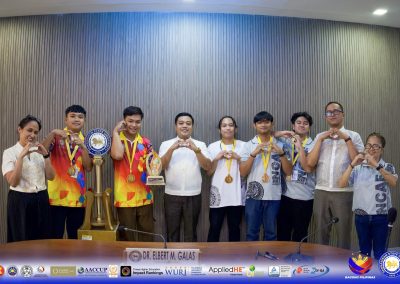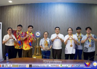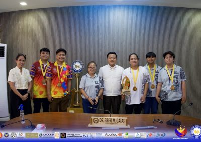 Dr. Renato Salcedo, Vice President for Local and International Affairs, and Dr. Jeanilyn Villanueva, Vice President for Administration and Finance Management, joined the group in its festive sharing of winning experience with the university president.