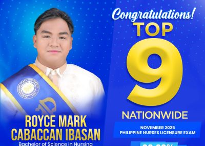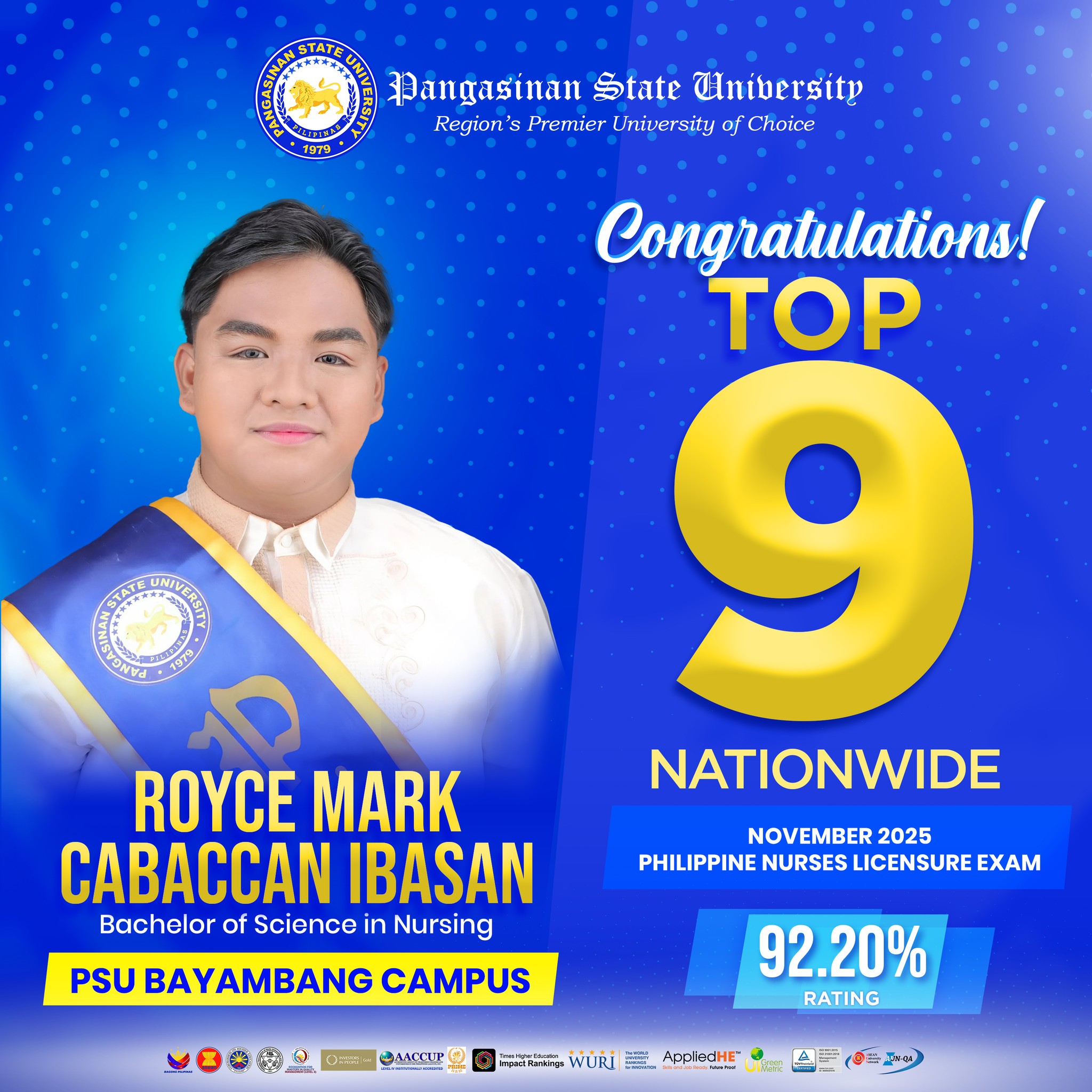 The Pangasinan State University is brimming with pride as ๐Œ๐ซ. ๐‘๐จ๐ฒ๐œ๐ž ๐Œ๐š๐ซ๐ค ๐‚๐š๐›๐š๐œ๐œ๐š๐ง ๐ˆ๐›๐š๐ฌ๐š๐ง secured 9th place in the November 2025 Philippine Nurses Licensure Examination (PNLE)โ€”the first-ever topnotcher produced by the PSU Institute of Nursing in its Bayambang Campus.