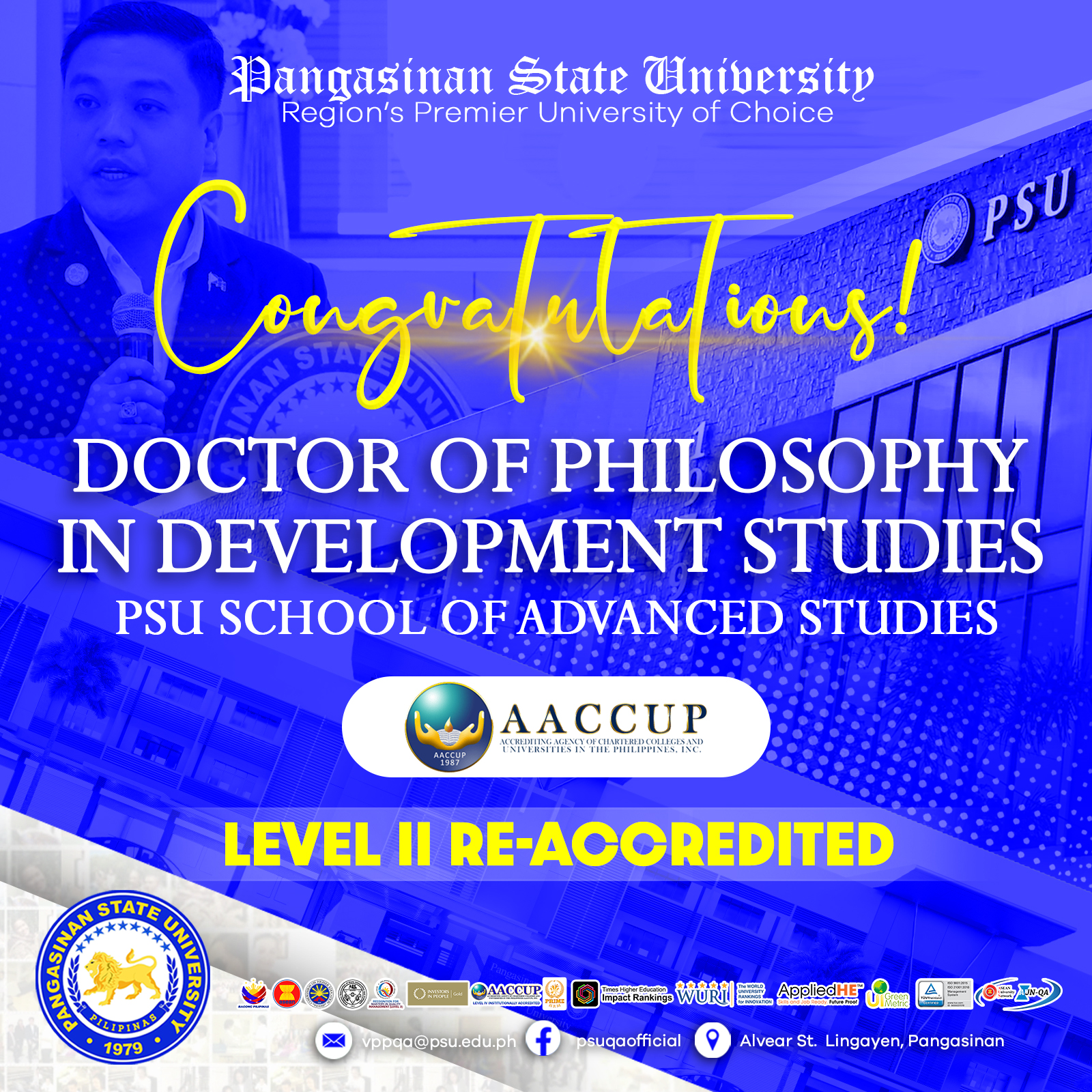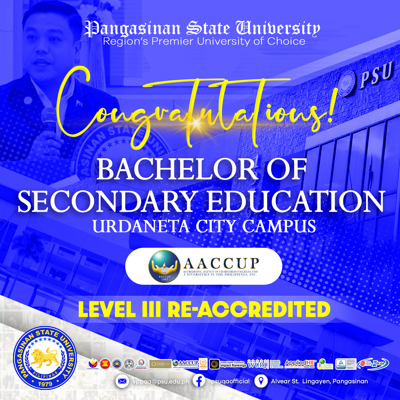 Pangasinan State University has once again affirmed its steadfast pursuit of academic excellence as five of its programs once again levelled up their accreditation statuses during the AACCUP surveys conducted on August 25β29, 2025 and August 27β29, 2025.