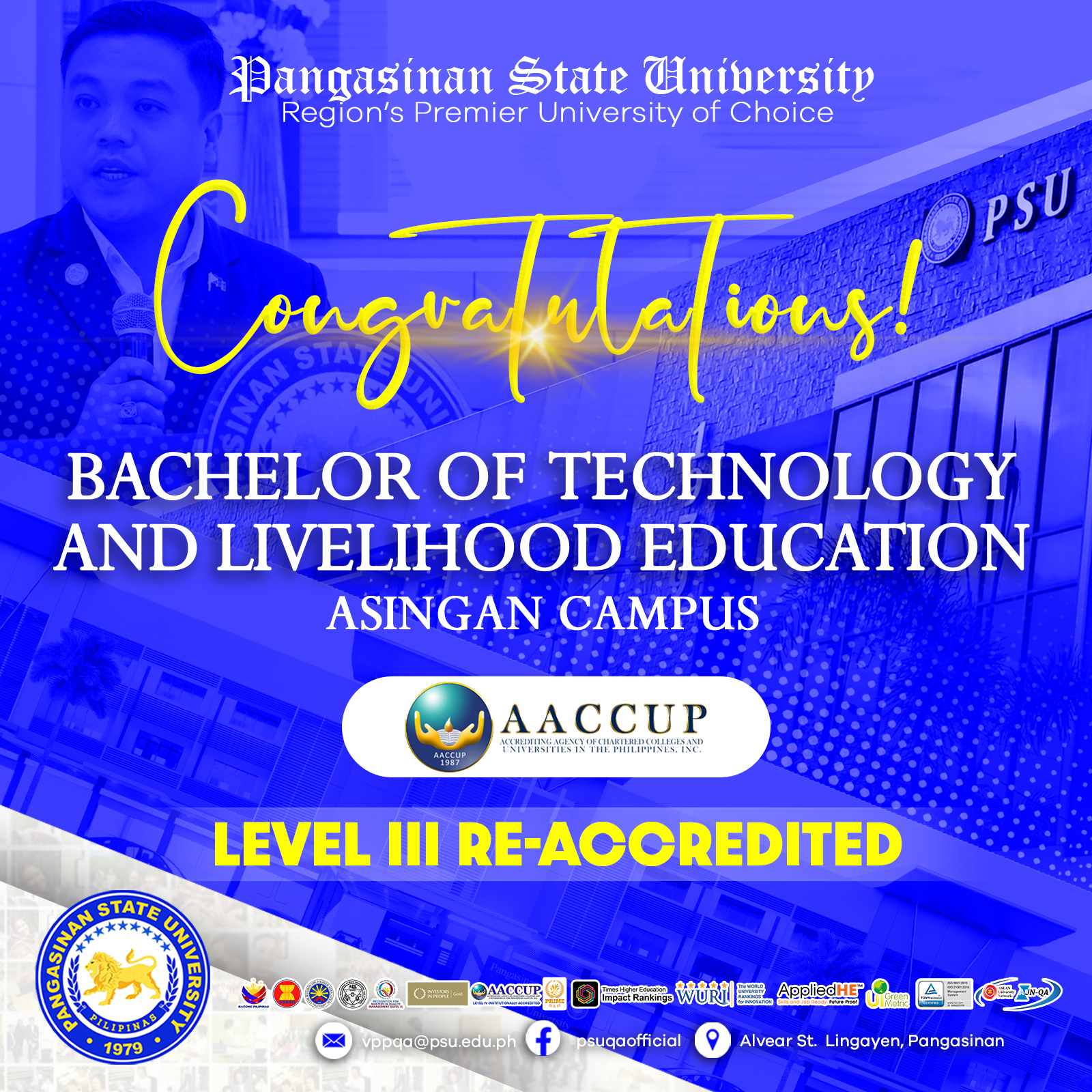 β’ Bachelor of Technology and Livelihood Education β Asingan Campus
