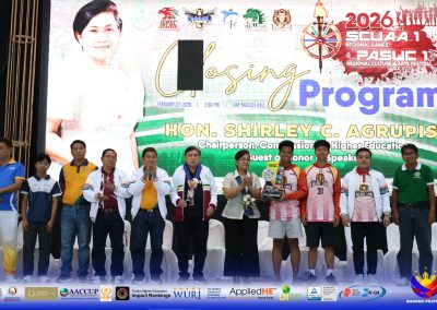 Commission on Higher Education (CHED) Chair Dr. Shirley C. Agrupis, a true blue Ilocana, graced the event as Guest of Honor and Speaker, with an inspiring message emphasizing the role of athletics and cultural arts in holistic education and nation-building, noting that the SCUAA-PASUC 1 Games exemplify CHED’s role in developing not just academically excellent students, but well-rounded individuals who embody the values of discipline, teamwork and cultural appreciation.